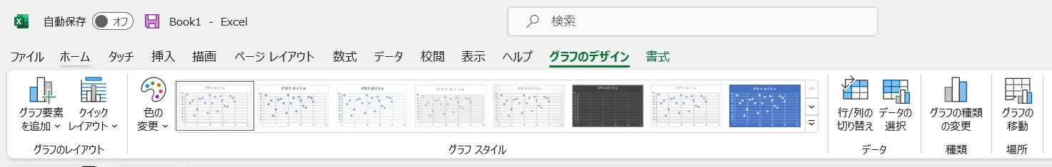 表示させたいグラフを作成したら,[グラフのデザイン],[書式]タブが表れます.