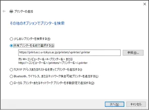 「その他のオプションでプリンターを検索」画面が開きます.「共有プリンターを名前で選択する(S)」をチェックし,直下のフォームに