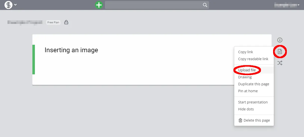 icon in the upper right corner, select “Upload file” (red circle in the image) to insert an image saved on your cell phone.