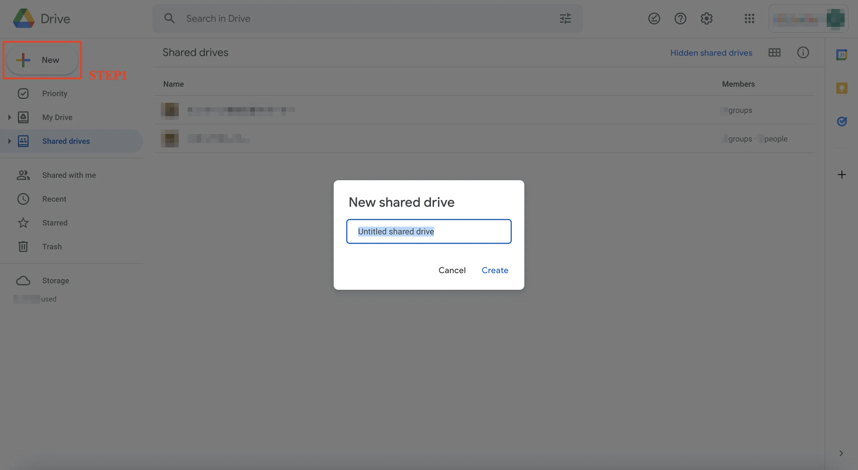 1. Create a shared drive: Log in to My Drive - Google Drive using your university Google account (ECCS Cloud Email Account), select the shared drive, and create a new shared folder.
