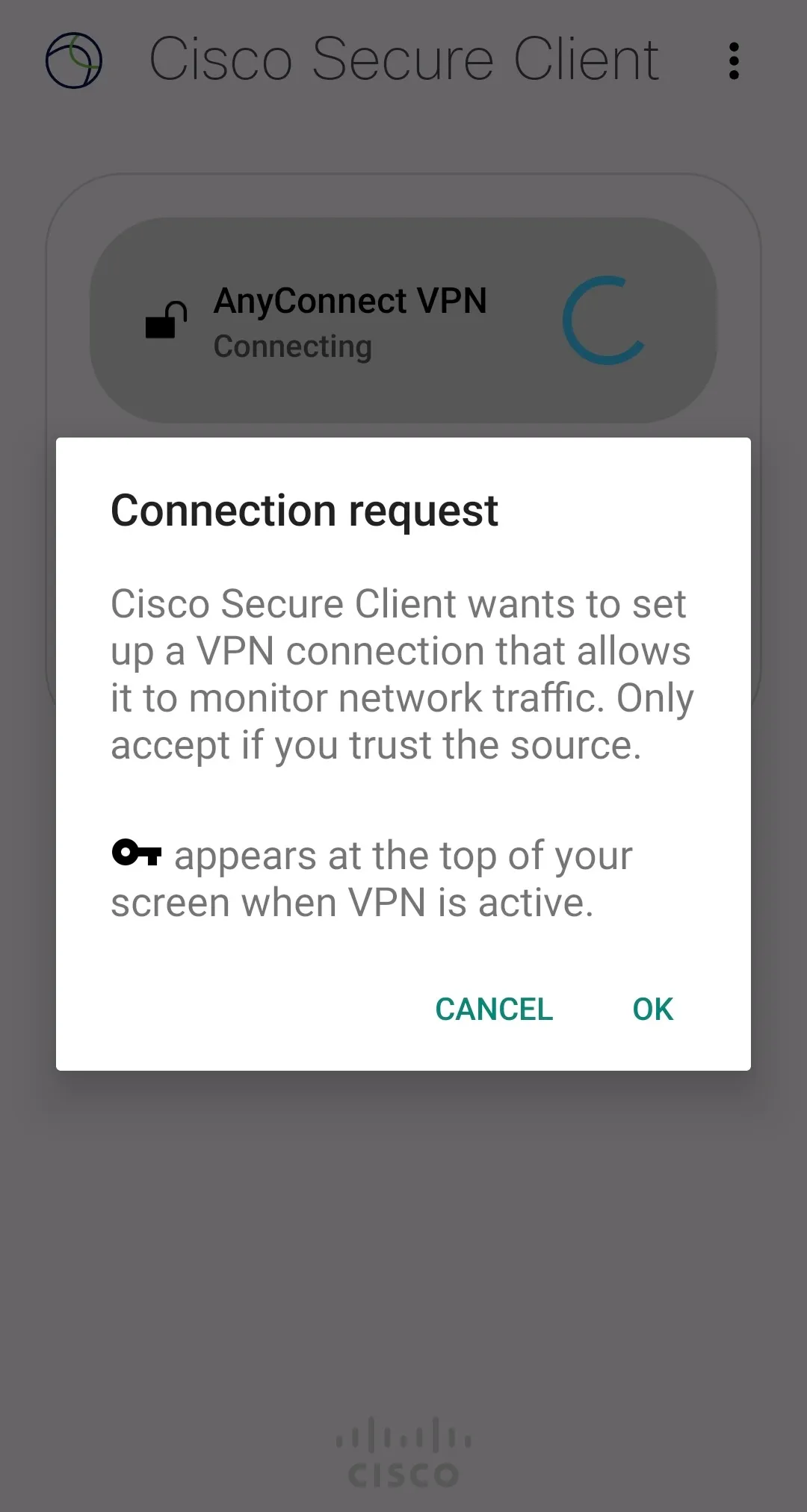 Step A: Access Google Play and install the Secure Client app from Cisco Systems. This app was previously named AnyConnect. Therefore, these two names are shown together in the following image.