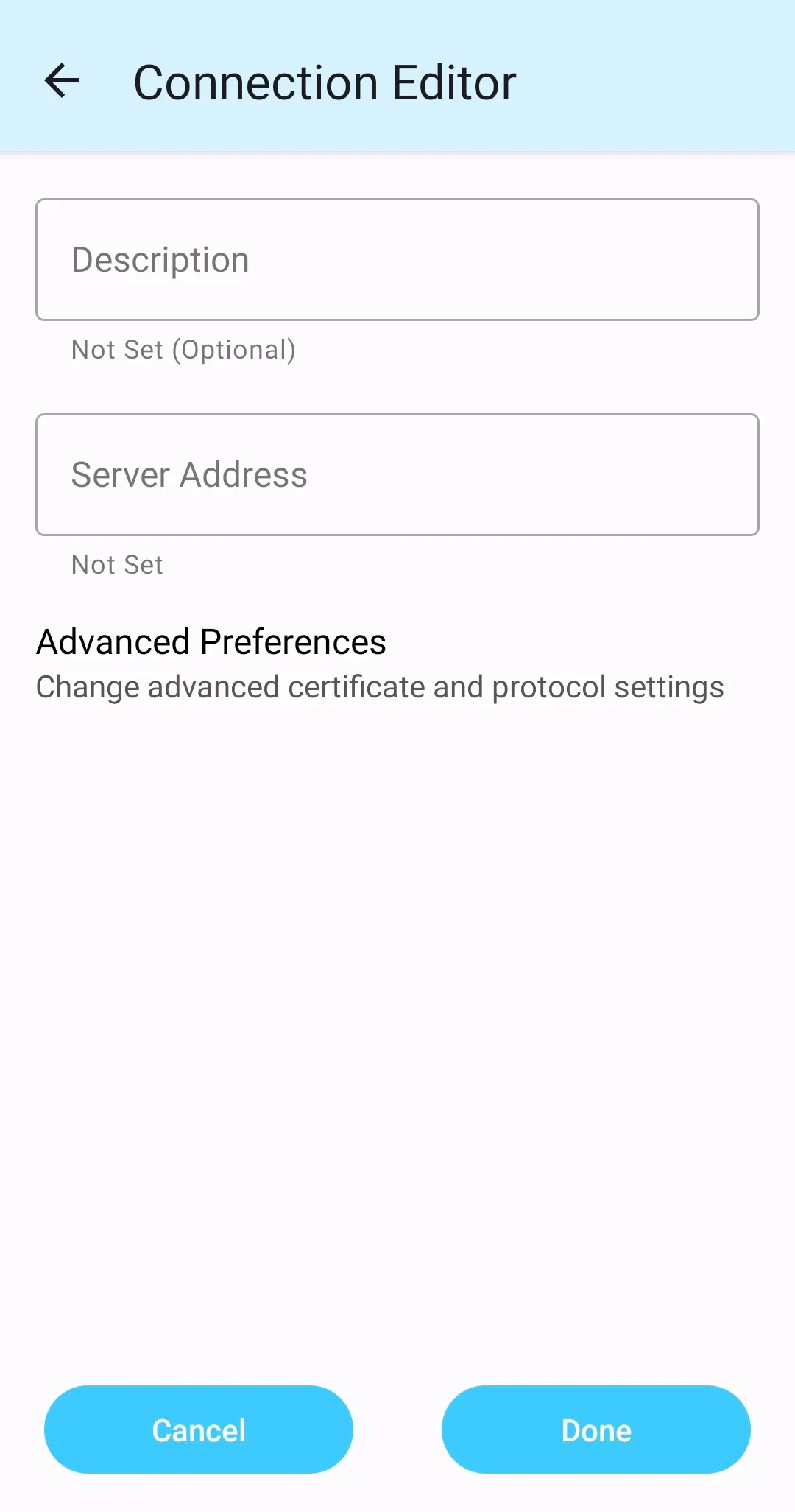 Step C: Tap “Connections” and tap the plus “+” button in the lower right corner. The “Connection Editor” will appear as shown below. Tap “Server Address” and enter “vpn1.adm.u-tokyo.ac.jp”.
