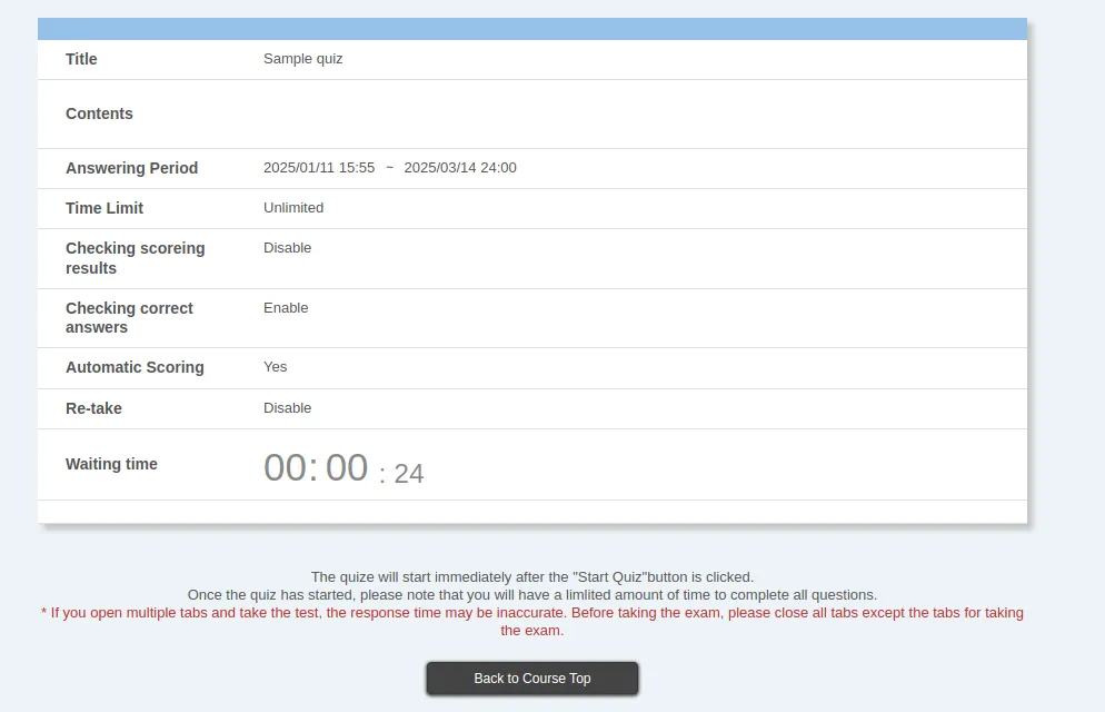 - Contents: A quiz description (supports the markup function).