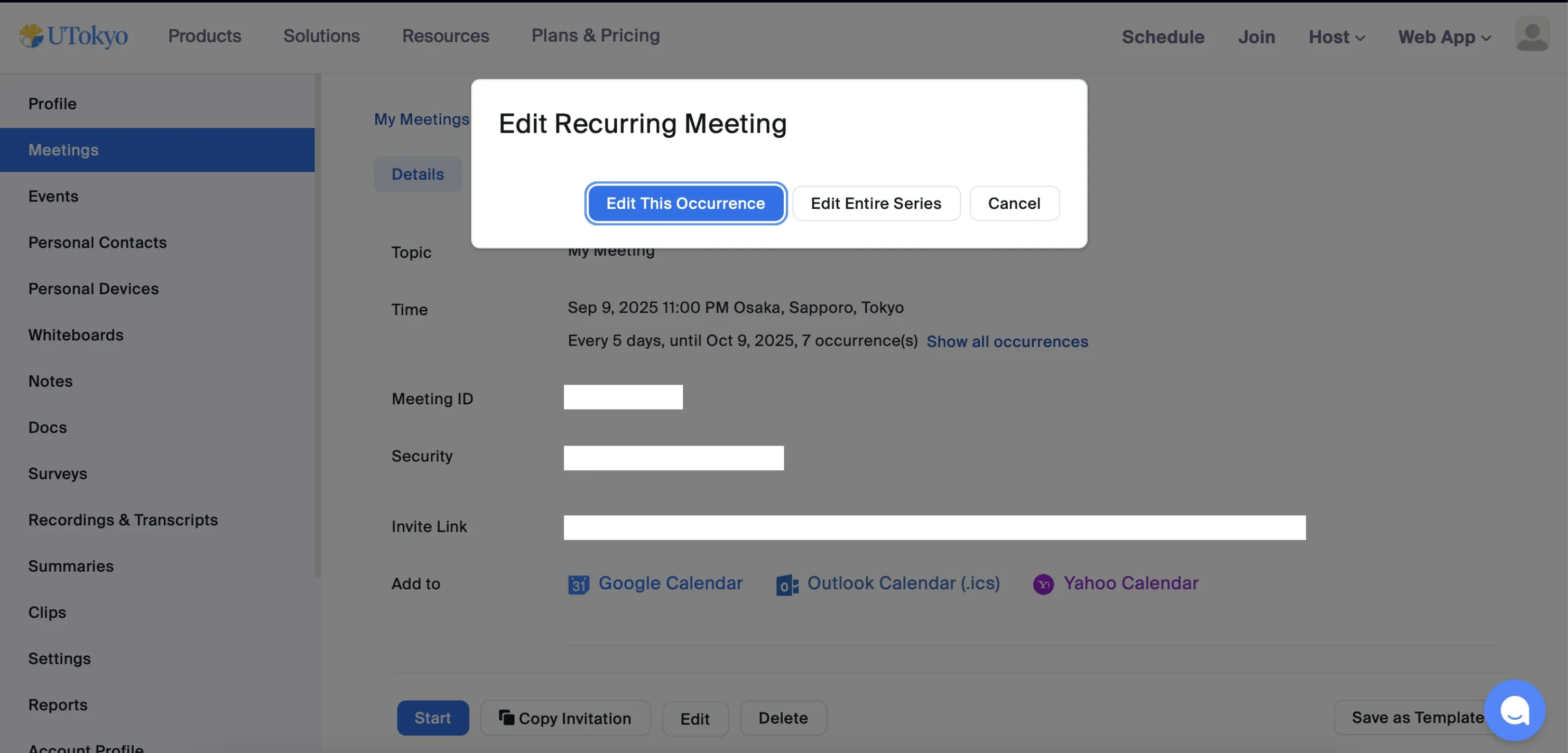 For recurring meetings, selecting Edit All Occurrences allows you to review and change settings for all instances at once. Selecting Edit This Occurrence lets you edit only a specific instance, but the items that can be reviewed or changed are limited.