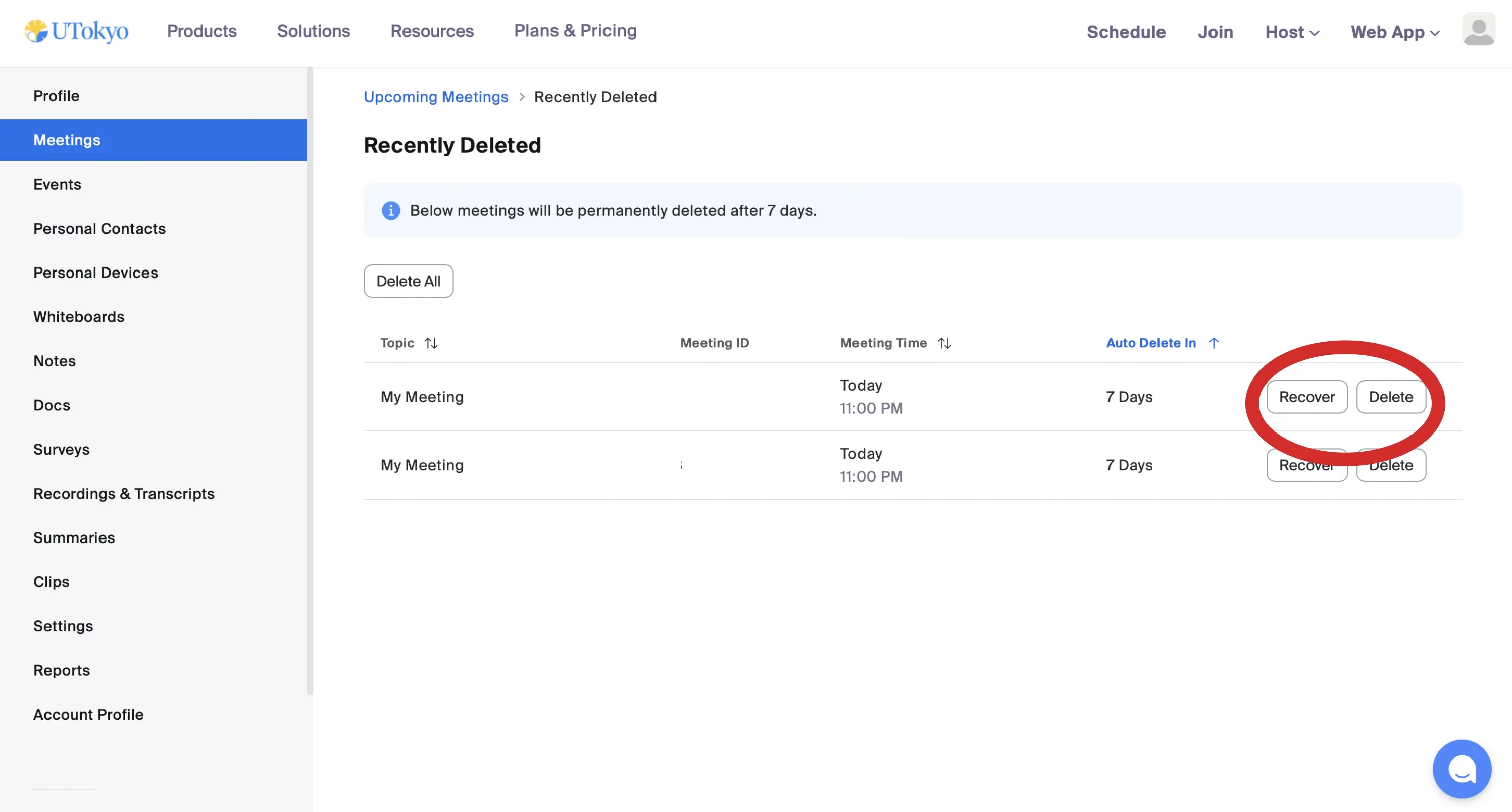 • Click Delete next to the meeting name to permanently delete the meeting without waiting for the 7-day retention period.