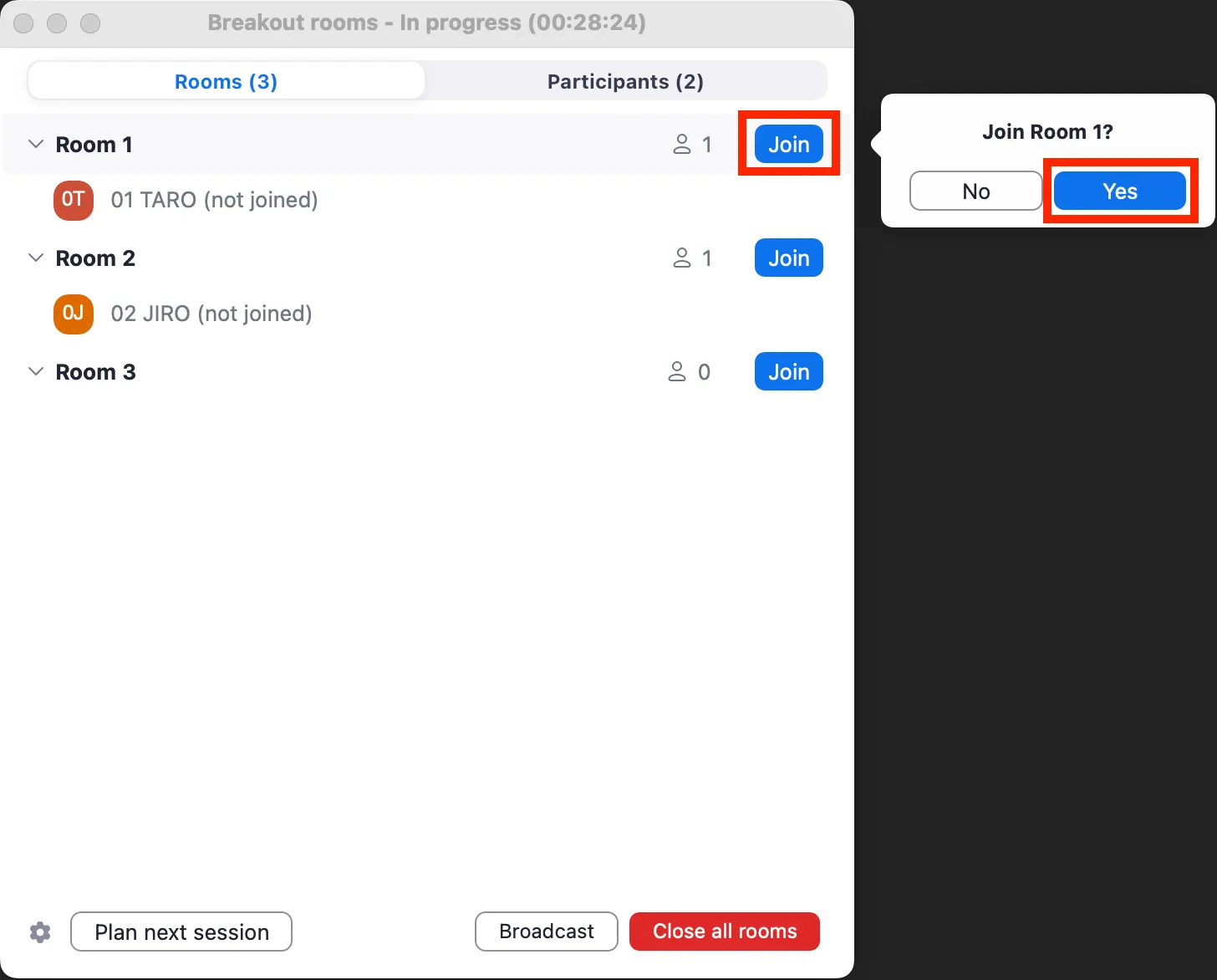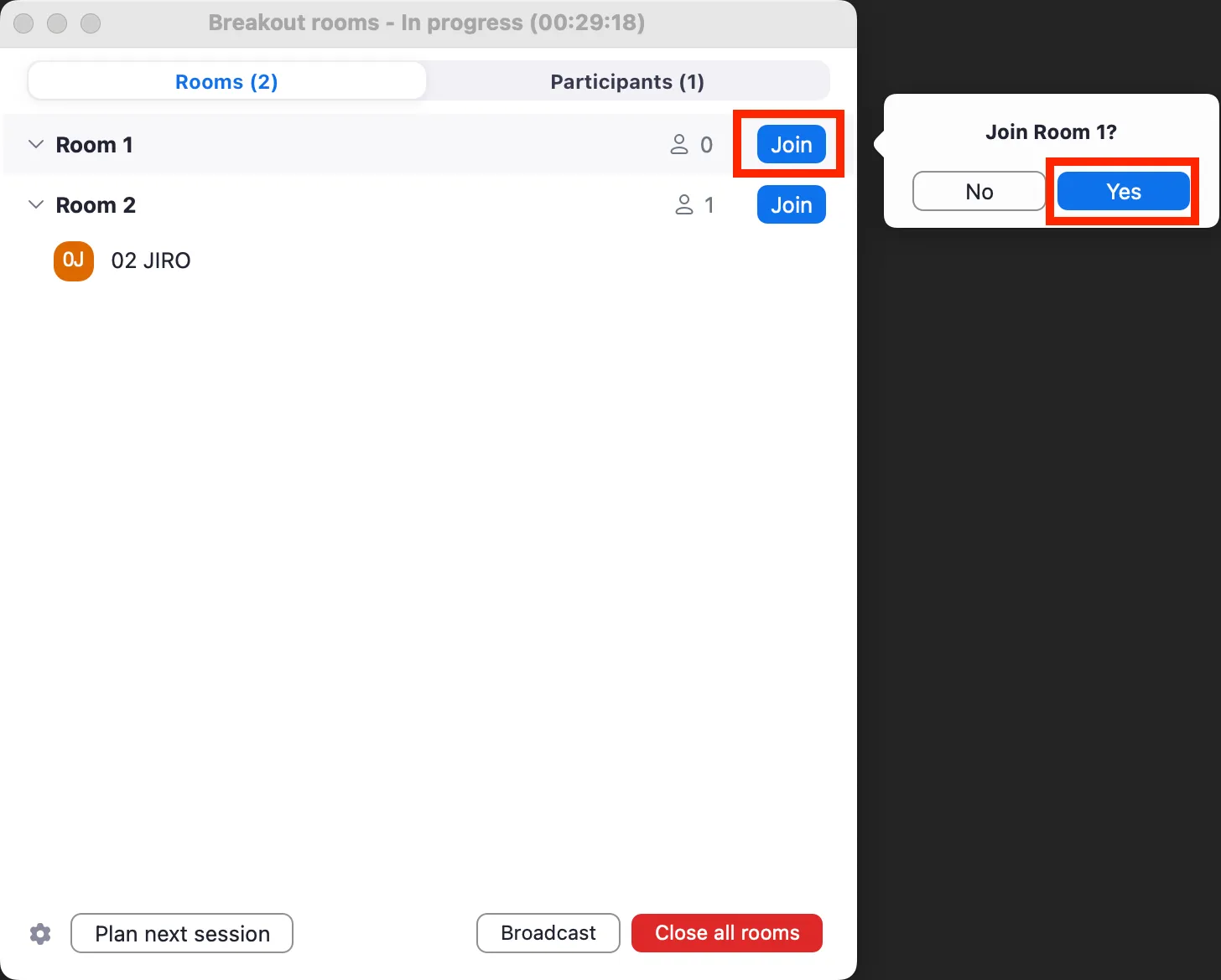 2. In the window that appears, click “Join” next to the room you want to join, then click “Yes”.