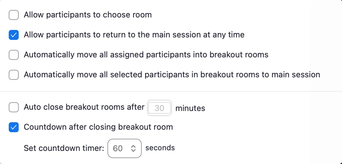 If no setting is configured, participants are immediately returned to the main meeting as soon as the breakout rooms are closed by the host or the scheduled end time is reached.