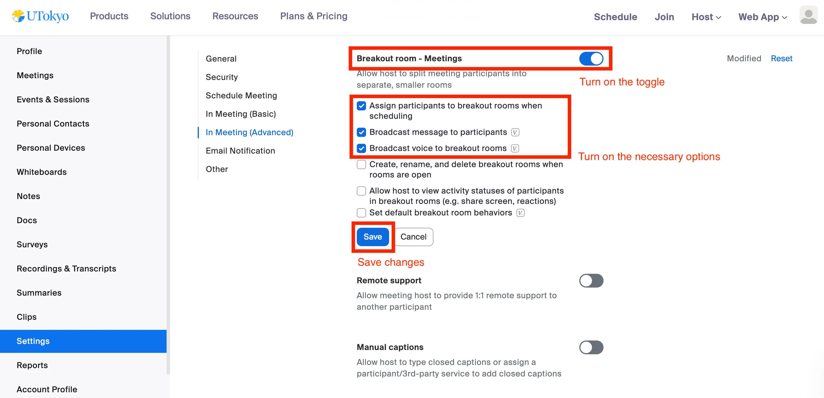 To use this feature, “Broadcast message to participants” and “Broadcast voice to breakout rooms” must be enabled along with the breakout room feature in your Zoom web portal settings. The steps to enable them are as follows: