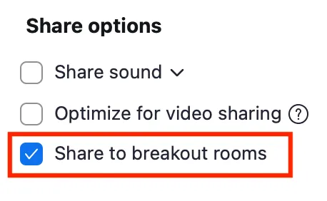 2. In the window’s “Layouts and options” section, check “Share to breakout rooms”. If you also want to share computer audio, check “Share sound”.