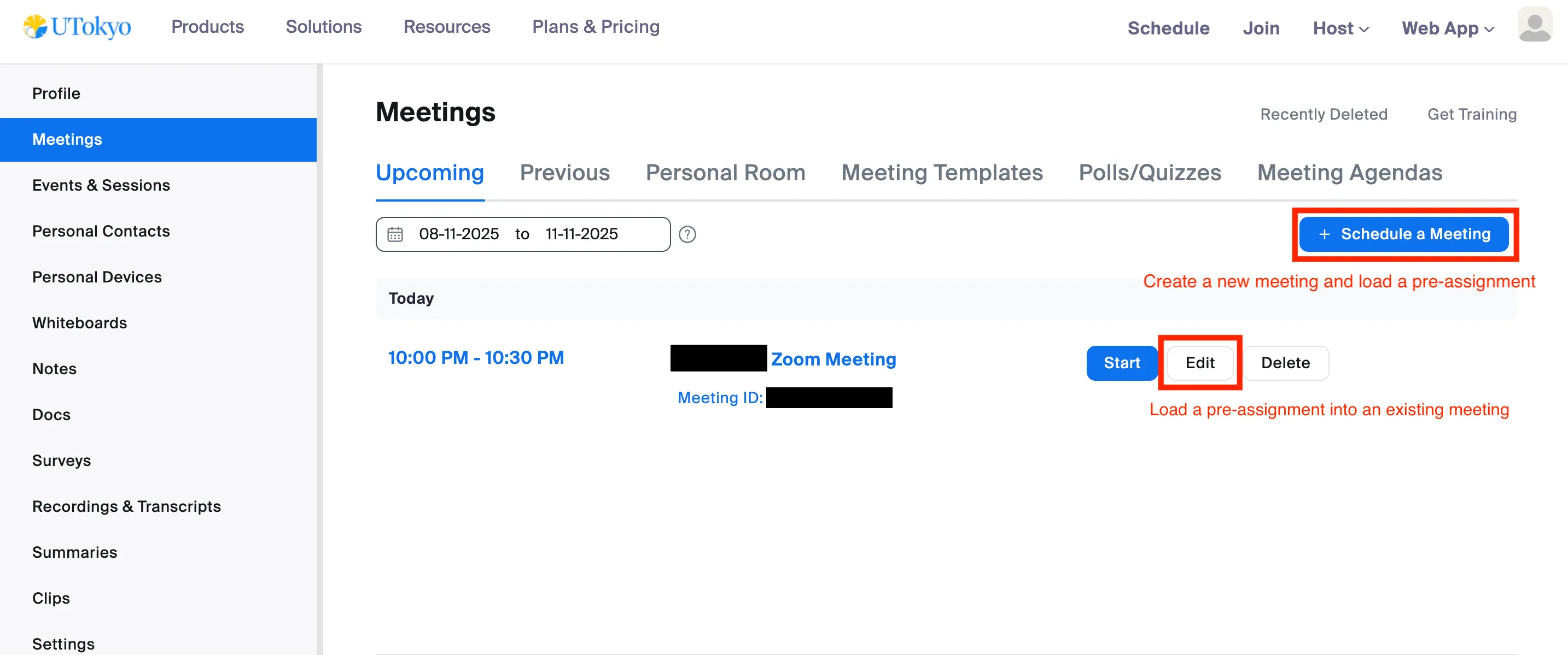 3. Click “Schedule a Meeting” to create a new meeting with pre-set assignments, or click “Edit” for an already scheduled meeting to load assignments into it.