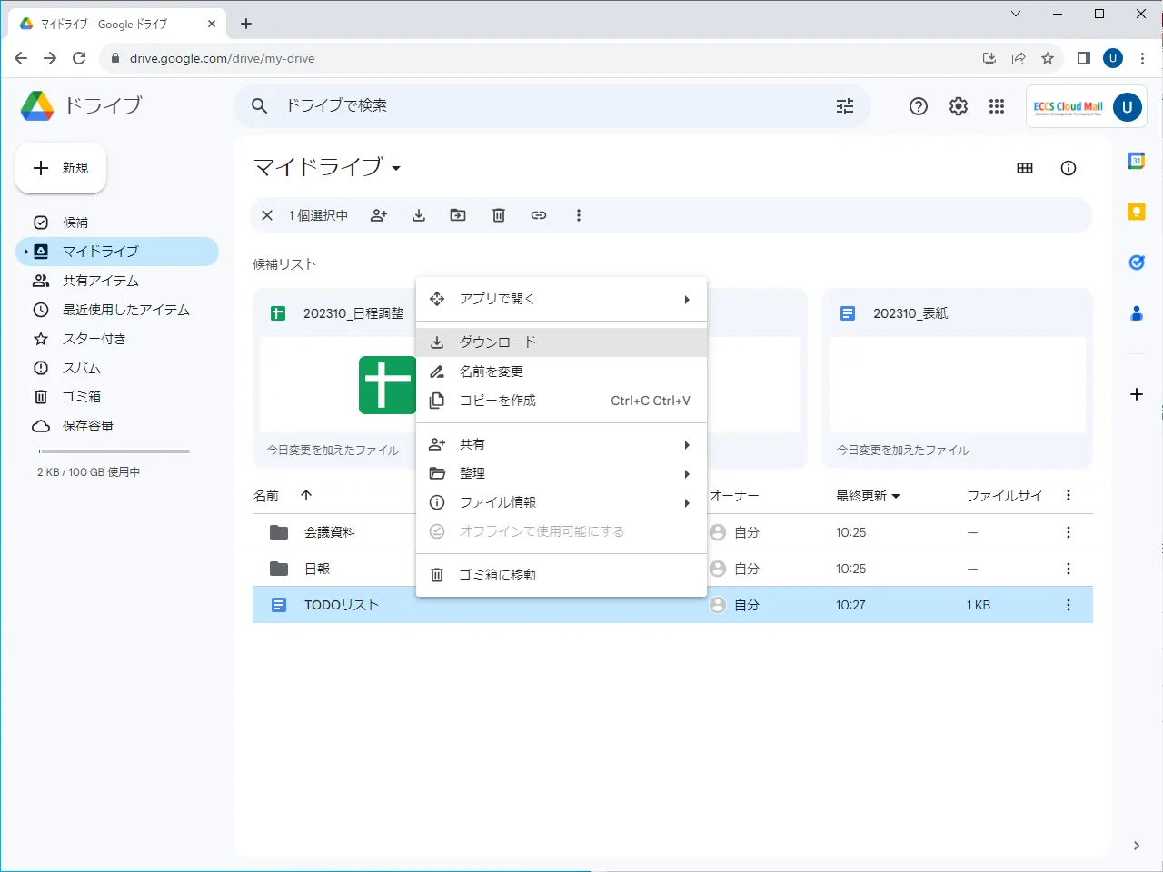 以降の手順を行うには,あらかじめECCSクラウドメールにログインし,ブラウザ上でGoogleドライブを開いている必要があります.この作業が完了していない場合には,Googleドライブのページの「ブラウザ上でGoogleドライブを開く」を参照してください.