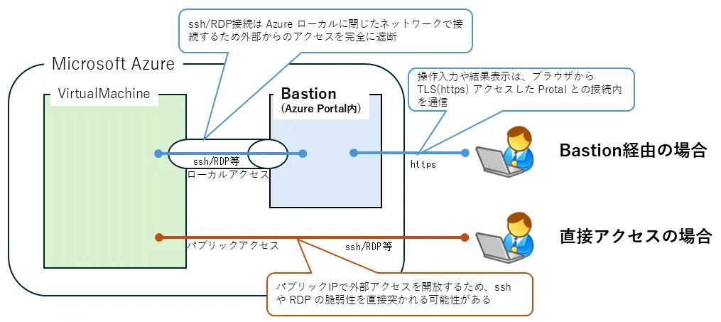 • Azure Portal 内に踏み台サーバとして構成され,仮想マシンへのアクセスは Bastion 経由で行う形になります.(下図参照)