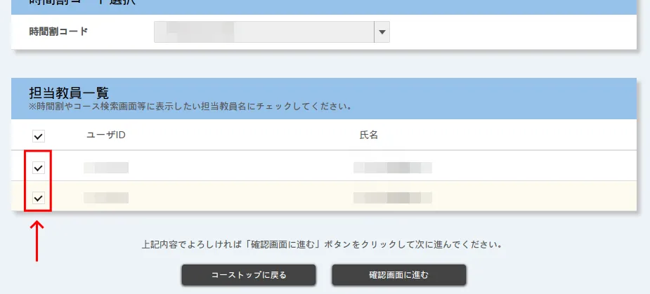 - 画面の下部に「担当教員一覧」という欄があります.表示させたい担当教員にチェックを入れ,表示させたくない担当教員のチェックを外してください.