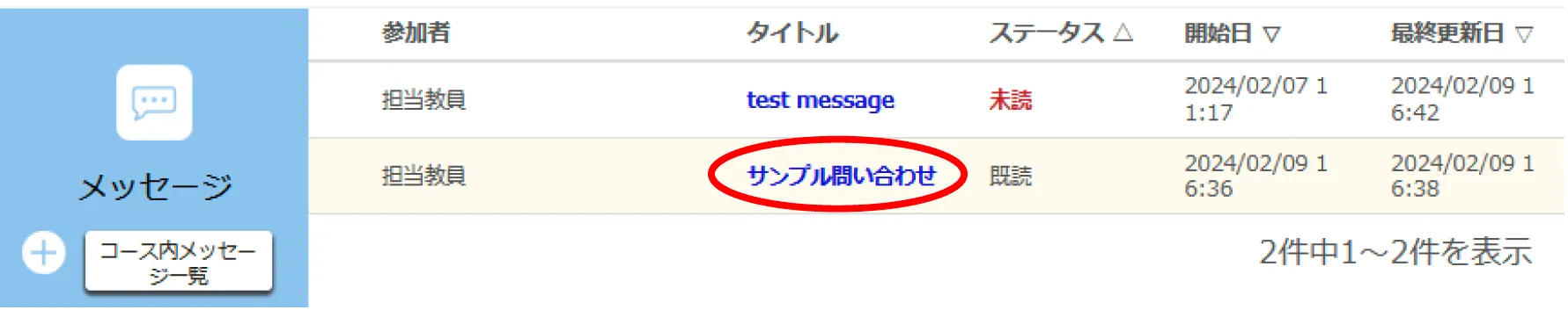 • 新しく会話が作られ,「ステータス」列に「未読」と表示されます.