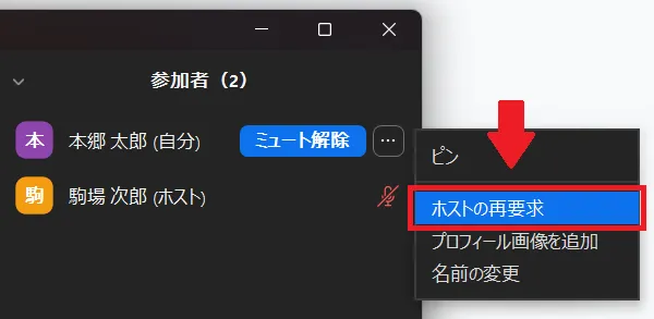 ミーティング中の「参加者」欄に表示されている自身の名前にマウスを合わせ,表示されたケバブメニュー(「…」のアイコン)をクリックし,「ホストの再要求」を選択することで,再びホストに戻ることが可能です.