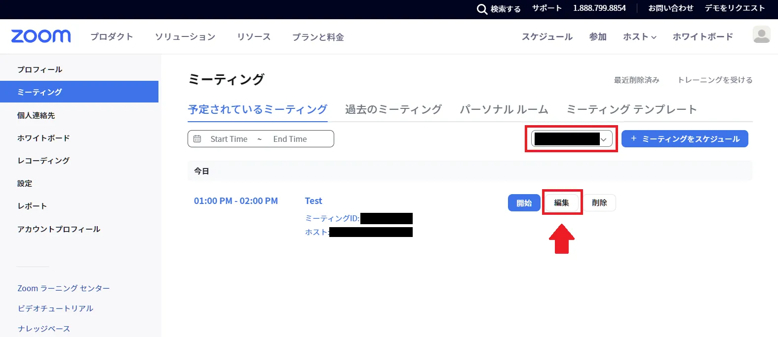 既に作成したミーティングに代替ホストを追加する場合は,「予定されているミーティング」を選択し,一覧に表示されているミーティングにカーソルを合わせてください.新しく「編集」が表示されるのでこれを選択してください.