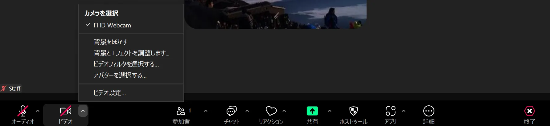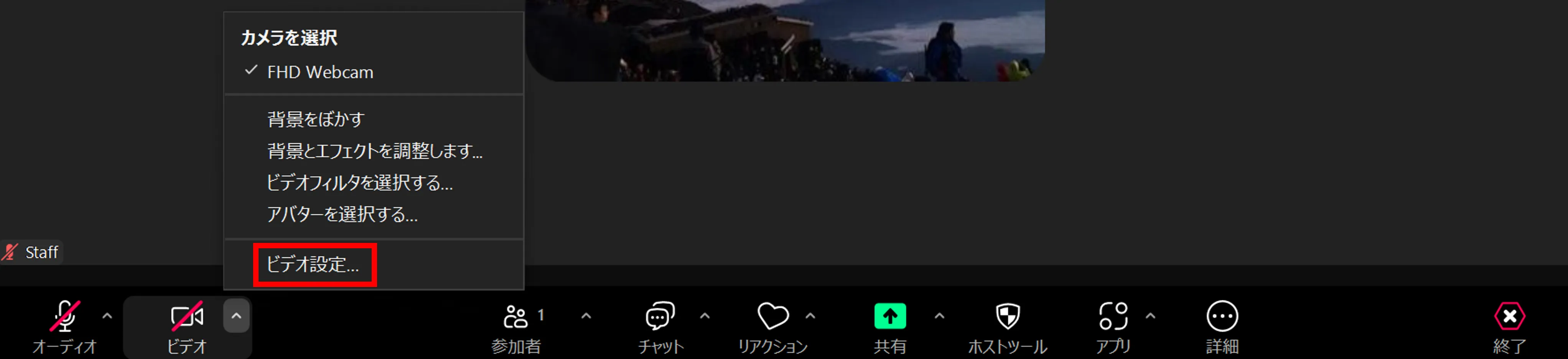 - ミーティング参加中:ビデオのアイコンの右上に表示されている矢印のマークを押し,「ビデオ設定」を押してください.