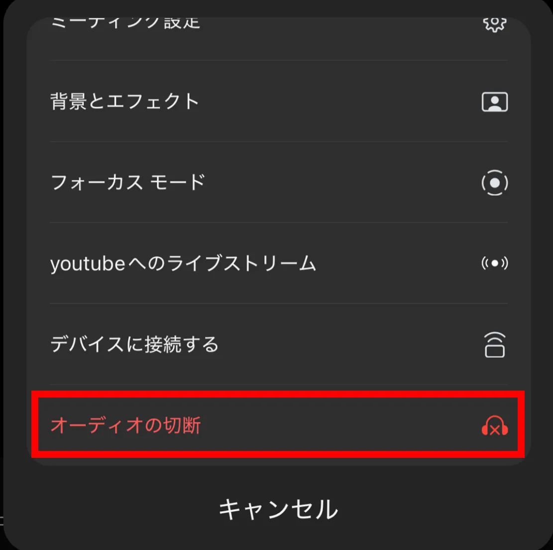 「詳細」と書かれたボタンを押すと表示されるメニューの一番下にある「オーディオの切断」を押してください.
